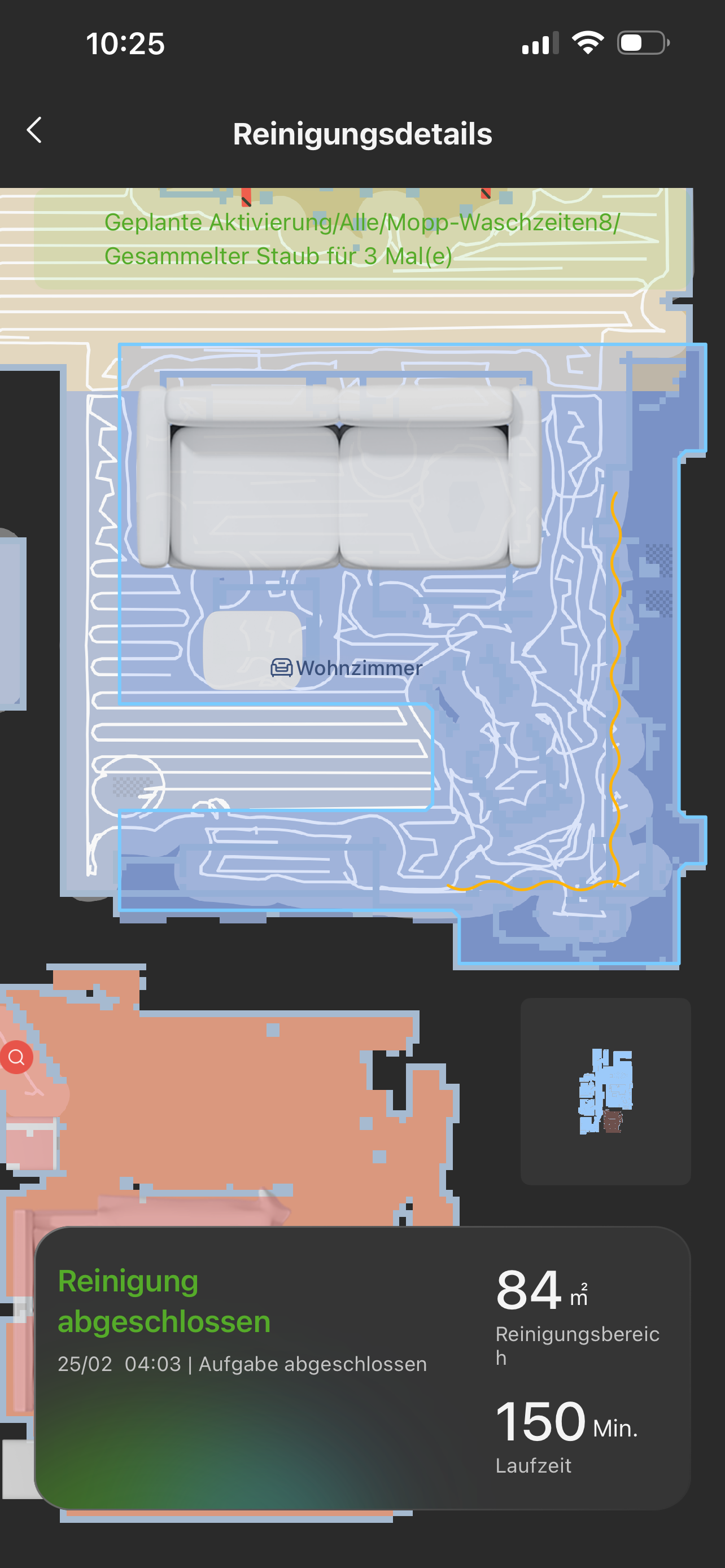 Wir wohnen in einer nicht sonderlich spektakulär geschnittenen oder eingerichteten Wohnung und insbesondere in unserem Wohnbereich versagt die Navigation komplett. Ich habe mal einen Screenshot angehängt. Der Raum ist offen und hat ziemlich genau 16qm. Hier steht eine Couch, ein Couchtisch ein Sessel und eine TV-Bank. Nur für diesen Bereich benötigt der Mova eine geschlagene Stunde. Der Dreame hat hier noch länger gebraucht und ist mit dem Raum nie fertig geworden, weil er zwischenladen musste. Unser alter Roborock S6 hat das ganze in 20 Minuten geschafft.