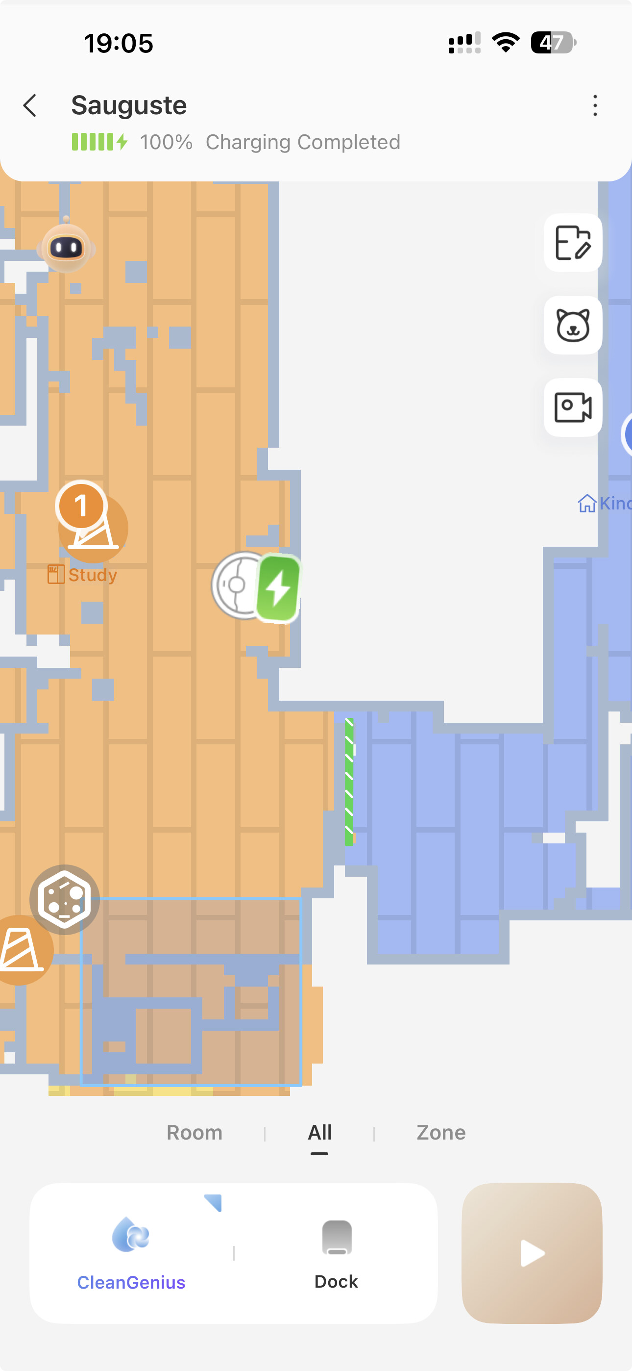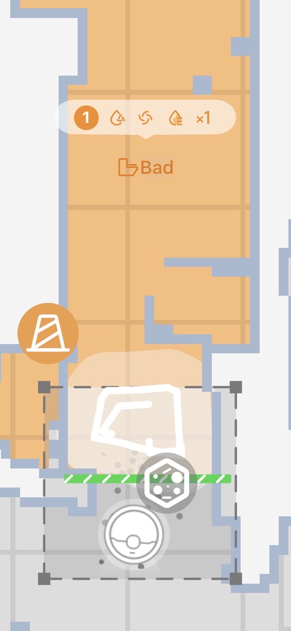 Sobald der V50 einige Krümel erkennt (z.B. Katzenstreu), unterbricht er die normale Reinigung, legt automatisch eine Zonenreinigung an und fährt diese mit hoher Saugkraft ab. Dabei scheint er jedoch die definierten Raumgrenzen und Türschwellen zu ignorieren und fährt minutenlang von Raum zu Raum, wobei er jedes Mal die etwa 2,5 cm hohe Türschwelle überquert. Das Verhalten wiederholt sich so lange, bis man manuell abbricht; ein Screenshot der Karte zeigt diese Schleife sehr deutlich.